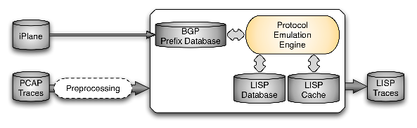 The LISP Cache emulator is software that is able to emulate the tasks of LISP xTRs and that is essentially designed to be fed with packet-level Internet traffic. Therefore, like a real LISP router, the emulator needs two data stores, namely the LISP Database and the LISP Cache.